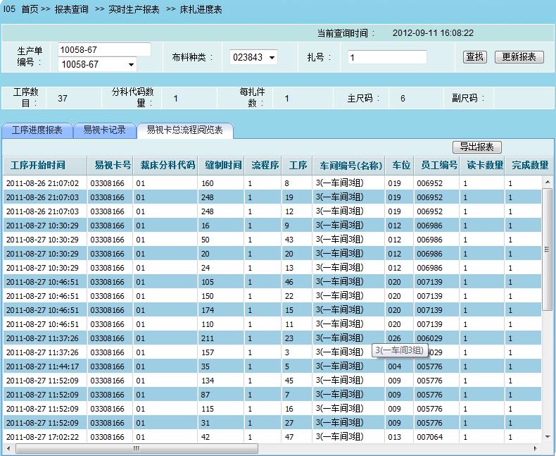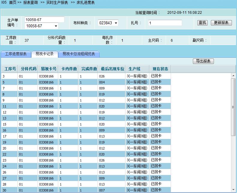 床扎进度表是查询具体某个扎的进度情况,含三个报表:工序进度表、易视卡记录表和易视卡总流程阅览表。